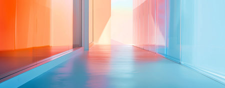 AI Generated. Empty corridor with pink and orange lights reflecting on the floor
