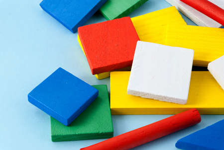 Abstract background. Texture with various colorful shapes of wooden blocks. Geometric shapes in different colors on a green background. The concept of creative, logical thinking or problem solving.