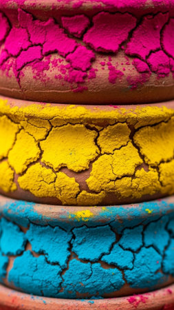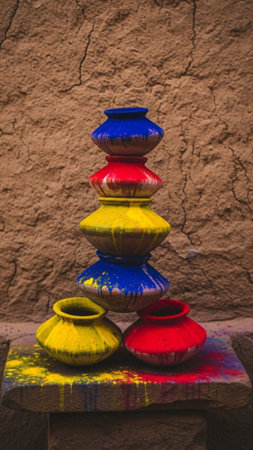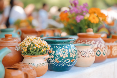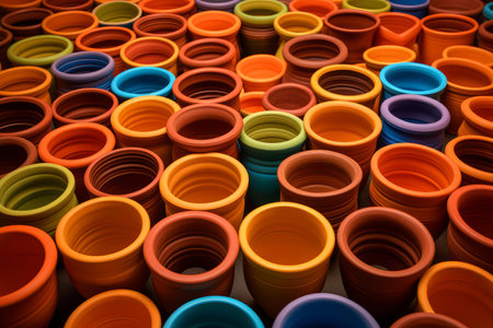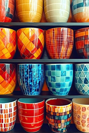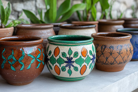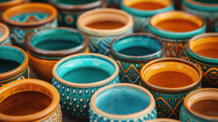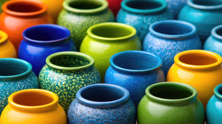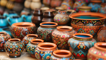 Vibrant collection of hand-painted ceramic pots with intricate patterns. That the image is generated using AI.