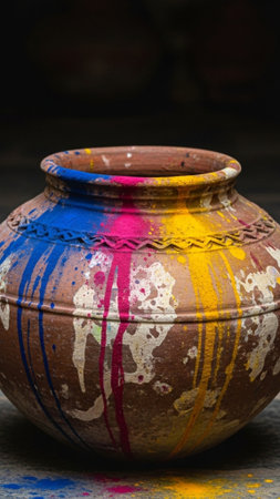 This image features a colorful handcrafted pot adorned with intricate patterns resting on a textured ground, showcasing the beauty of traditional craftsmanship and artistic design.