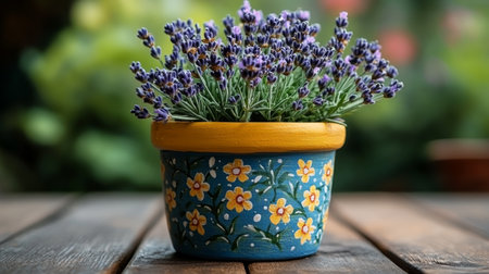 A colorful pot filled with blooming lavender sits atop a rustic wooden table, surrounded by a lush garden. The bright purple flowers draw attention in the sunny outdoor setting.