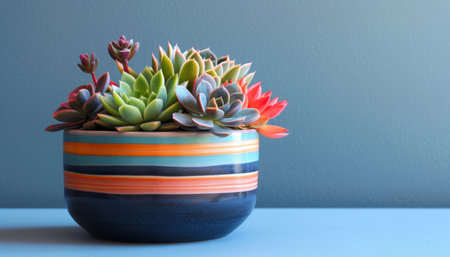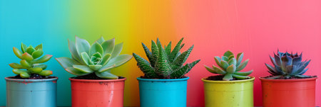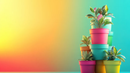 A visually striking arrangement of colorful potted plants stacked elegantly against a softly blurred background of gradient shades. The vibrant pots and lush greens create an inviting atmosphere perfect for home decor or gardening inspiration.
