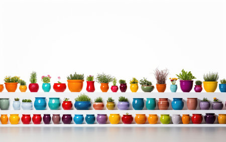 Ceramic clay flower and plant pots with colourful floral ornaments in pottery studio isolated on white background with copy space.