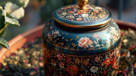 A closeup of a tea canister adorned with a beautiful label and filled with a fragrant blend of tea leaves