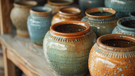 Detailed close-up of handcrafted pottery, showcasing sustainable art with natural clay and glazes, highlighted by soft lighting.