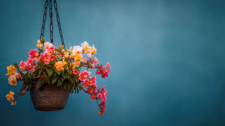 A stunning image showcasing a vibrant hanging flower basket filled with colorful blossoms, gracefully suspended against a soft blue background, perfect for enhancing any garden or home decor.