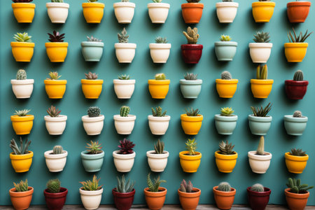 A row of potted plants in various colors sit on a wall. The plants are arranged in a way that creates a sense of harmony and balance. The colors of the plants and the pots complement each other