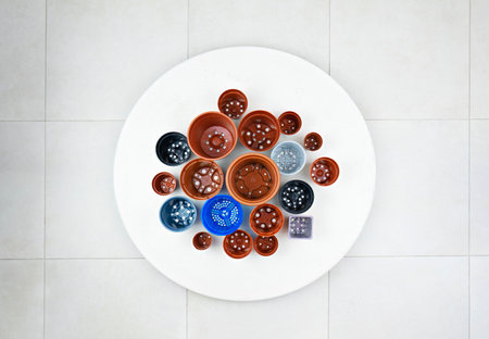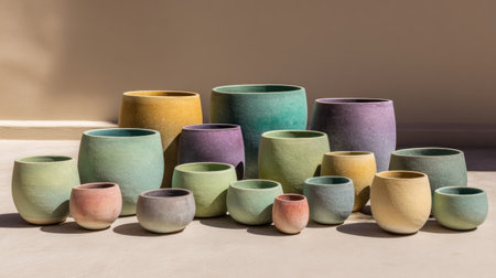 Various colorful ceramic plant pots arranged on concrete floor. Empty geometric ceramic planter background.