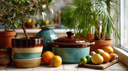 A charming kitchen scene featuring potted plants and colorful fresh fruits arranged on a countertop, highlighted by warm natural light.