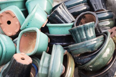 Vintage. Unique handmade ceramic vases. Clay pots stacked in a yard. Pottery making place. Local craft