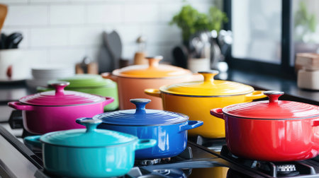 A collection of colorful enameled cast iron pots and pans on a stove, with their vibrant hues adding a touch of style to the kitchen.