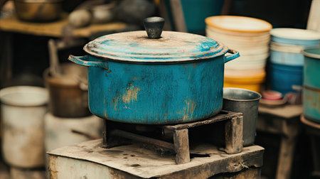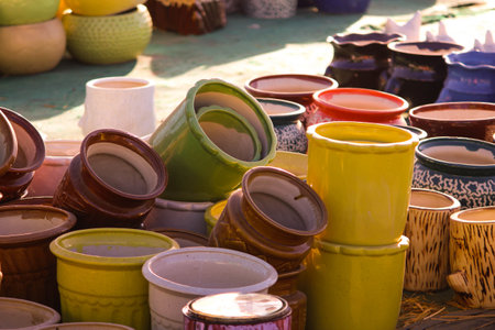 colored clay pots on the counter of the store abstraction background retro design, interiors design decoration design
