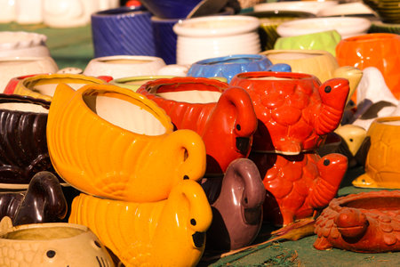 Traditional Indian handmade Items of Earthenware Or Ceramic at a Vendor Stall,decorative Sculpture Made with Earthen Mud, handcrafted traditional clay decoration toy in indian market
