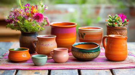Brighten your space with a vibrant collection of handcrafted ceramic pots and vases, beautifully arranged on a rustic wooden table, adorned with fresh flowers.