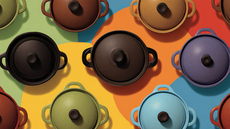 A vibrant arrangement of colorful cast iron cooking pots set against a striking patterned background, showcasing a modern kitchen aesthetic and culinary creativity.