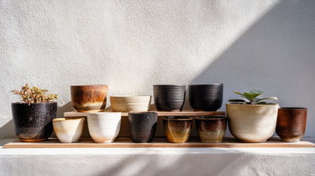 A stunning collection of modern ceramic pots with unique designs and textures, beautifully arranged on a wooden shelf, illuminated by natural light, enhancing the cozy atmosphere.