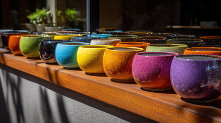 A stunning display of colorful ceramic pots sits on a wooden ledge, illuminated by natural light. The vibrant hues and unique textures create an inviting and serene atmosphere.