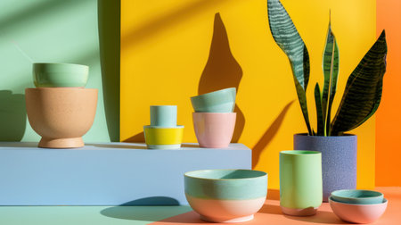 This image showcases a vibrant arrangement of colorful tableware on a bold background, enhanced by natural light and lush plant accents for a stylish look.