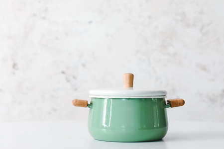 A metal pot on an electric induction cooker in a modern kitchen. Copy space.