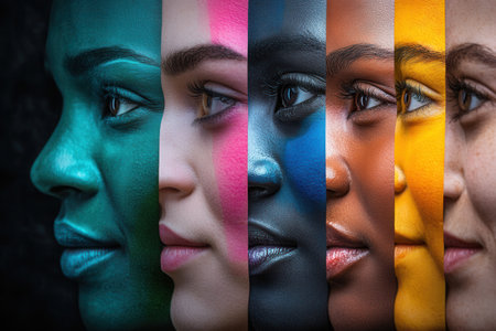 Faces of different backgrounds are separated by color barriers, illustrating themes of division and celebrating diversity in bright contrasts.