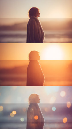 A collage of three photos of a woman in different outfits and backgrounds, showcasing her in a black dress at sunset, and in a white shirt against blue and yellow backgrounds.