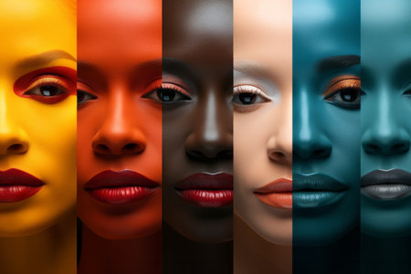 Collage of six women's faces in profile, with various skin tones and makeup, against colored backgrounds.