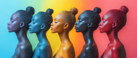Five women with elegant hairstyles stand in profile, showcasing diverse skin tones against a bright gradient backdrop.