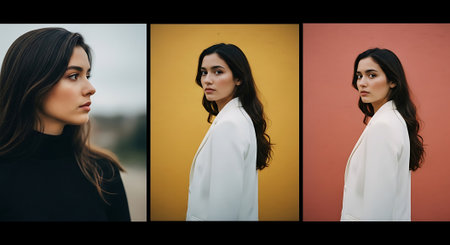 A collage of three photos of a woman with long dark hair, wearing different outfits and standing against various colored backgrounds, showcasing her in a black turtleneck and white blazers.