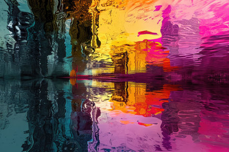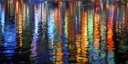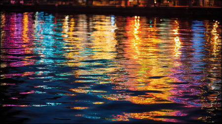 Colorful reflections of city lights dance on a rippled water surface at night, vibrant and blurred