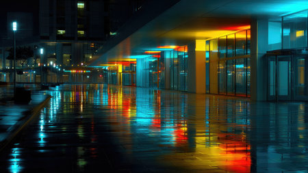 A captivating nighttime urban scene featuring vibrant neon lights reflecting on a wet pavement, showcasing sleek modern architecture and empty streets.