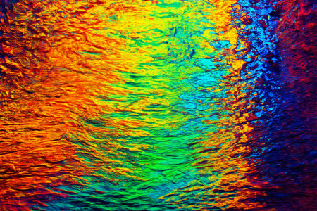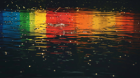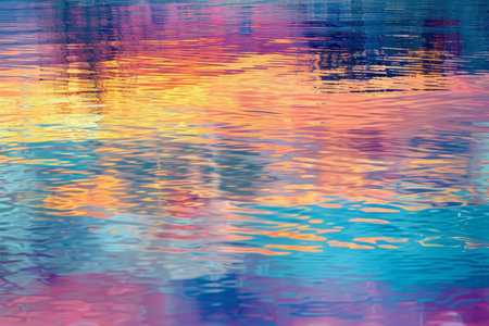 Rainbow colors are reflecting on a tranquil lake water surface, creating a vibrant and colorful abstract image