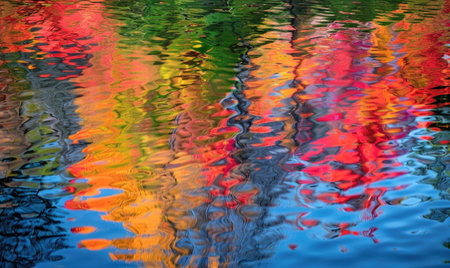 The vibrant colors of autumn foliage are beautifully reflected on the calm surface of a lake, creating a stunning natural abstract