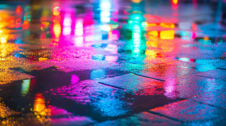 A close-up of vibrant neon lights reflecting off wet pavement, with colorful patterns and hues creating a dynamic, glowing effect.