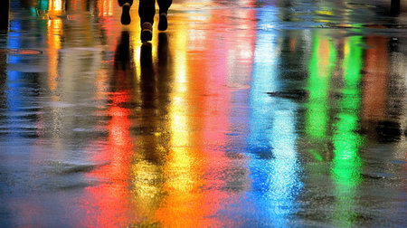 Vibrant hues dance on a wet pavement as rain paints a lively reflection of the urban landscape.