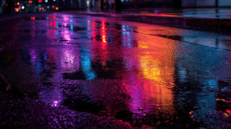 This image captures a nighttime street scene, featuring vibrant reflections on a wet pavement. Bright lights create colorful patterns across the surface. The composition utilizes a low angle, emphasizing the textures and reflective quality. This photograph could be suitable for various commercial or editorial applications, offering a moody and artistic visual.