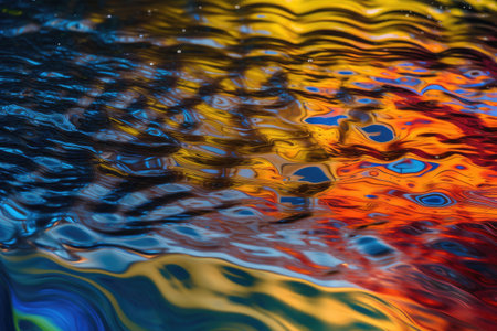 Rippling water surface with colorful reflections of blue, orange, and yellow light