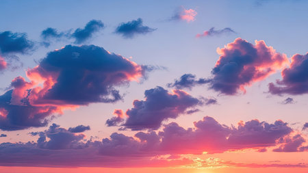 Stunning sunset sky filled with vibrant hues of purple, pink, and orange, creating serene and dreamy atmosphere. clouds are softly illuminated, enhancing beauty of scene