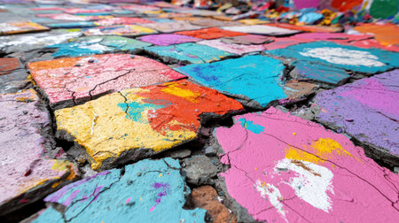 A close-up view of vibrant, cracked tiles showcasing colorful urban street art, perfect for evoking creativity and uniqueness in design projects.