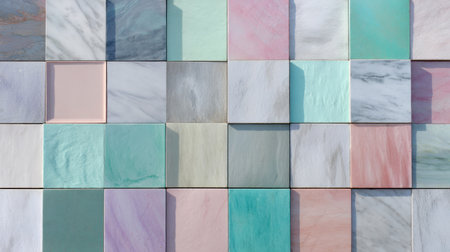 A close-up view reveals a repeating pattern of pastel-colored tiles intersected by a sharp, contrasting shadow, creating an abstract and visually striking composition.