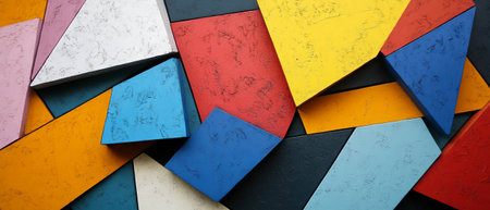 Abstract geometric shapes collage with vibrant triangles and bold colors.