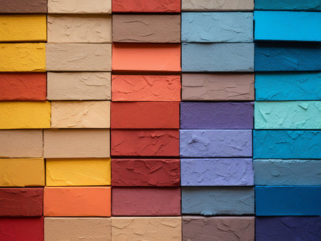 Brightly colored brick texture showcasing vibrant hues and flat shading in a structured layout