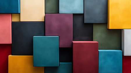 This image features a vibrant pattern of rectangular blocks arranged in a seemingly random configuration. The composition showcases a variety of colors, including reds, blues, greens, and purples, creating a visually stimulating effect. The design could be employed in various commercial and editorial applications to enhance visual appeal.