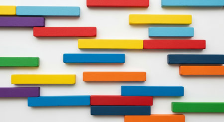 A close-up shot of colorful wooden blocks, neatly arranged, highlighting their diverse colors.