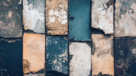 Broken tiles arranged in a line, highlighting cracked patterns and rugged textures in a construction setting