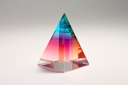 A vibrant transparent pyramid prism showcases a beautiful light spectrum against a soft gray background, creating an artistic and minimalist aesthetic for contemporary art lovers.