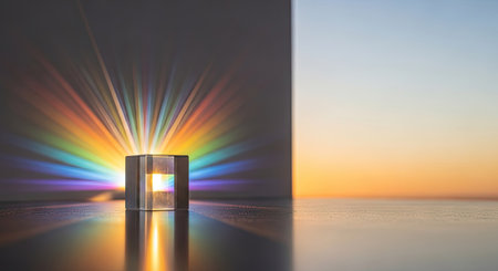 A Prism refracting rainbow colors onto clean white surface, creating vibrant display of light