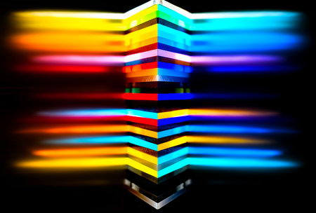 Various sizes of glass prisms and dichroic stripes dispersing light into multiple color spectra, creating a dynamic and colorful display.