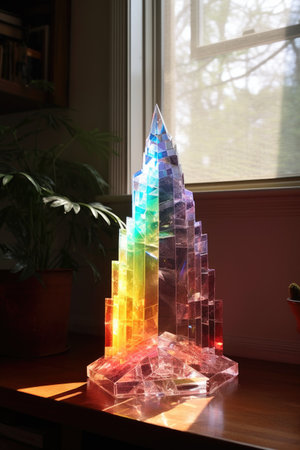 A prism stands on a surface while sunlight passes through, casting vibrant colors and patterns around it.