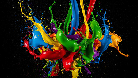 A vivid display of multicolored paint splashing against a dark background, creating a dynamic and energetic scene.
