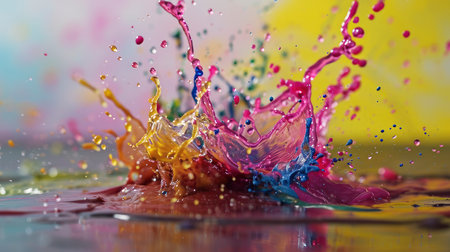 Dynamic Paint Splash Explosion in Motion A high-speed capture of vibrant acrylic paint splashing mid-air in bold primary colors, frozen
